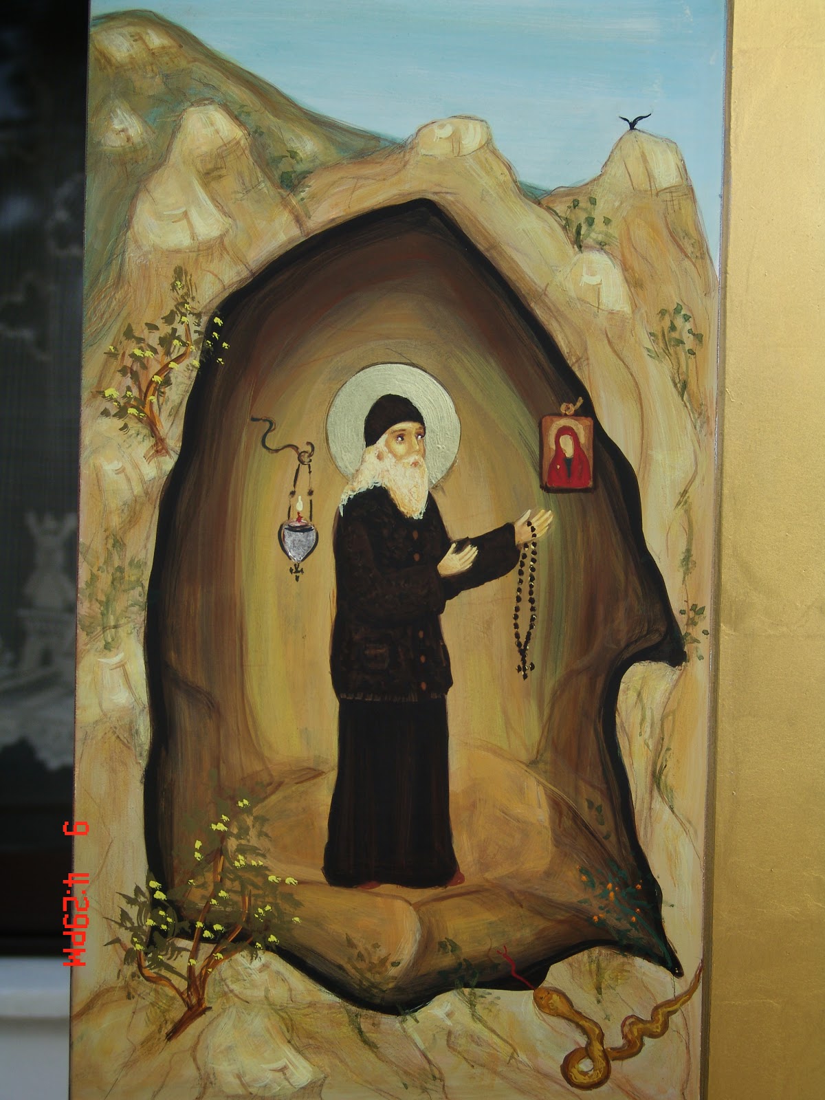 Κάποια νύκτα ἐνῶ βρισκόταν κοντὰ στὴ Μονὴ προσευχόμενος παρατήρησε στήλη ὑπέρλαμπρου φωτὸς νὰ κατέρχεται ἀπὸ τὸν οὐρανὸ καὶ νὰ στέκεται πάνω ἀπὸ ἕνα αἰωνόβιο δένδρο ἐλιᾶς. Ἀπόρησε βλέποντας τὸ παράδοξο θέαμα, πλησίασε στὸ μέρος ἐκεῖνο ποὺ ὑποδείκνυε τὸ οὐράνιο φῶς καὶ βρῆκε μία παλαιὰ Εἰκόνα τῆς Ὑπεραγίας Θεοτόκου. Γονάτισε μὲ δέος, τὴν σήκωσε στὰ χέρια του καὶ τὴν ἀσπάστηκε μὲ πνευματικὴ χαρὰ καὶ ἀγαλλίαση ψάλλοντας ὕμνους δοξολογίας στὸν Θεὸ καὶ ᾄσματα εὐγνωμοσύνης στὴ Θεομήτορα γιὰ τὴ θαυμαστὴ εὐδοκία τῆς χάριτός της.